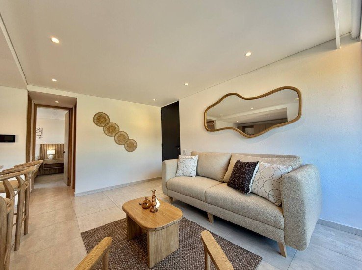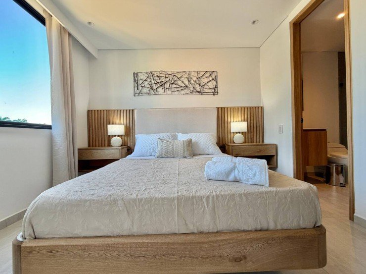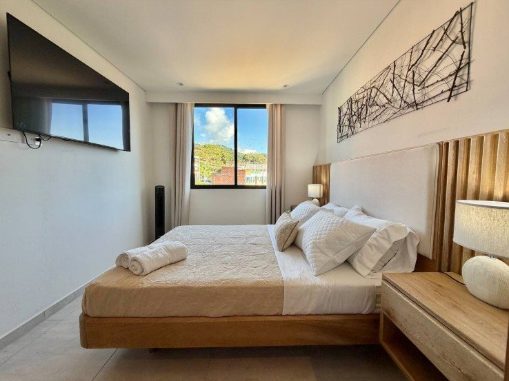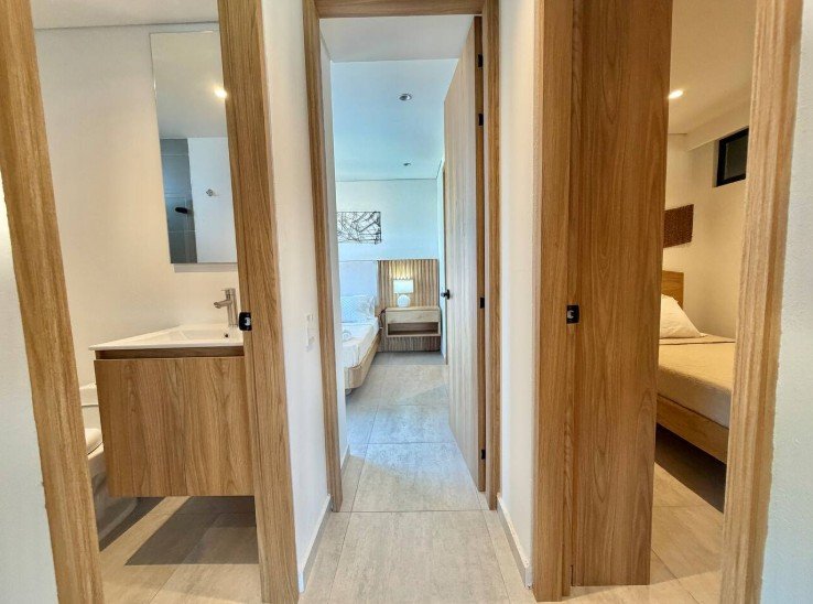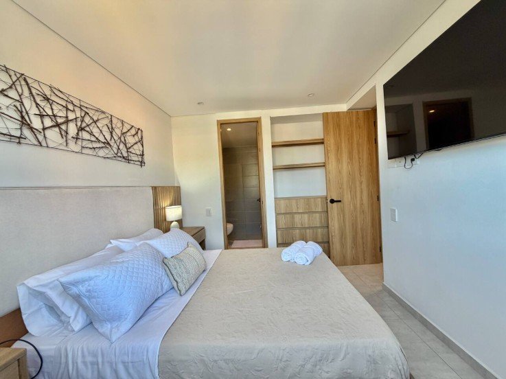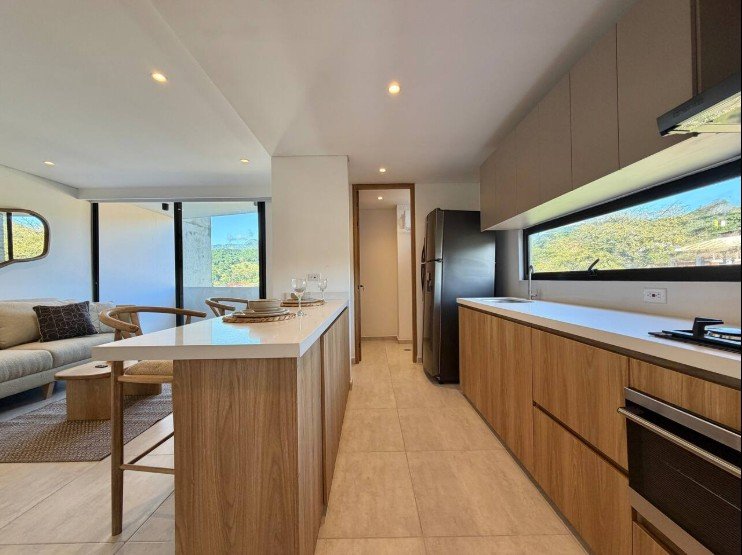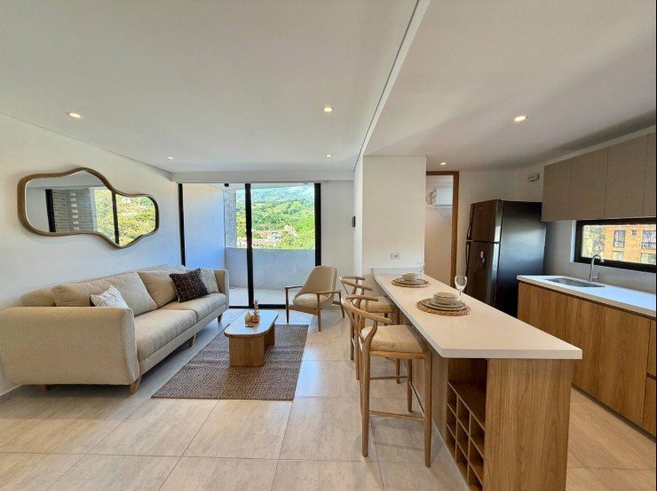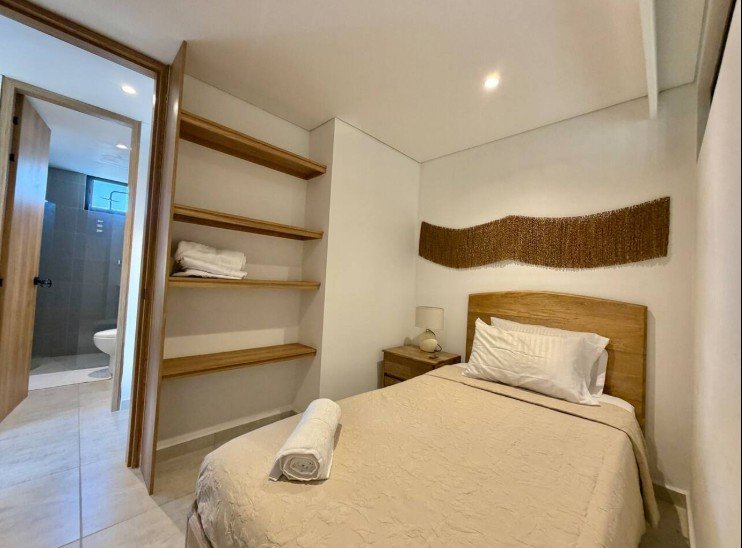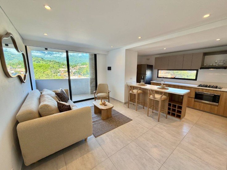 • Área: 55.33 M2 • 2 Habitaciones • 2 Baños completos • 1 Balcón en sala • Cocina Integral • Zona de ropas • Parqueadero y Deposito asignados • Vista Exterior del edificio (Piscina)